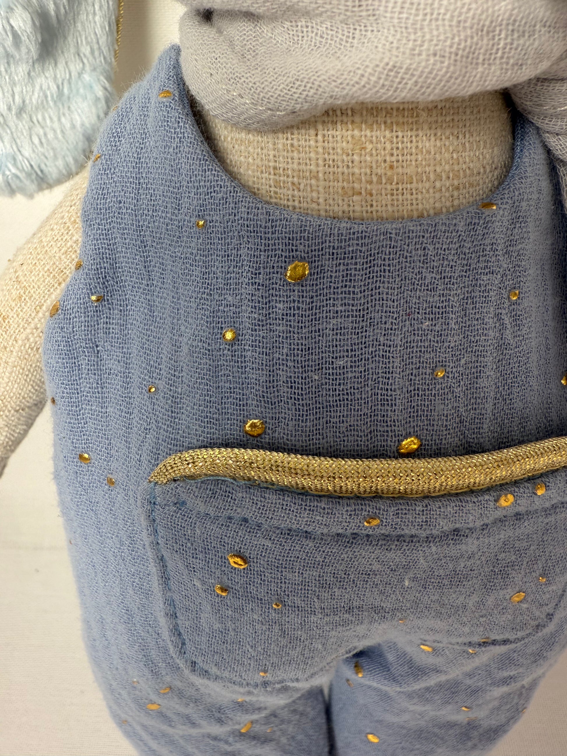 Voici Luca , un petit lapin plein de tendresse réalisé entièrement à la main dans mon atelier. Avec ses longues oreilles moelleuses en tissu minky ou polaire et sa salopette bleu ciel et sa douce écharpe assortie en double regard à pois dorés , Luca incarne la délicatesse, la douceur et l'innocence rêveuse de l'enfance.