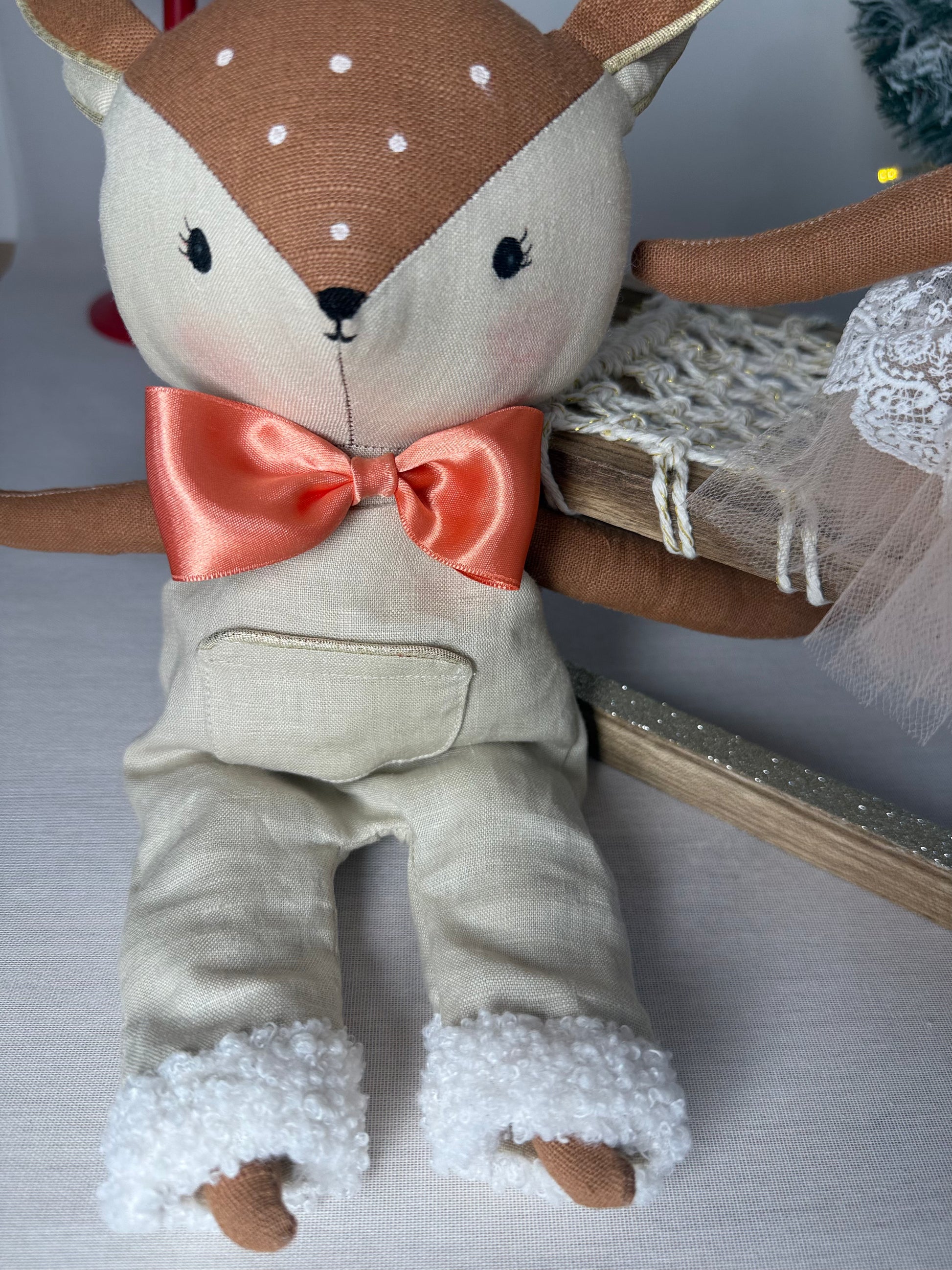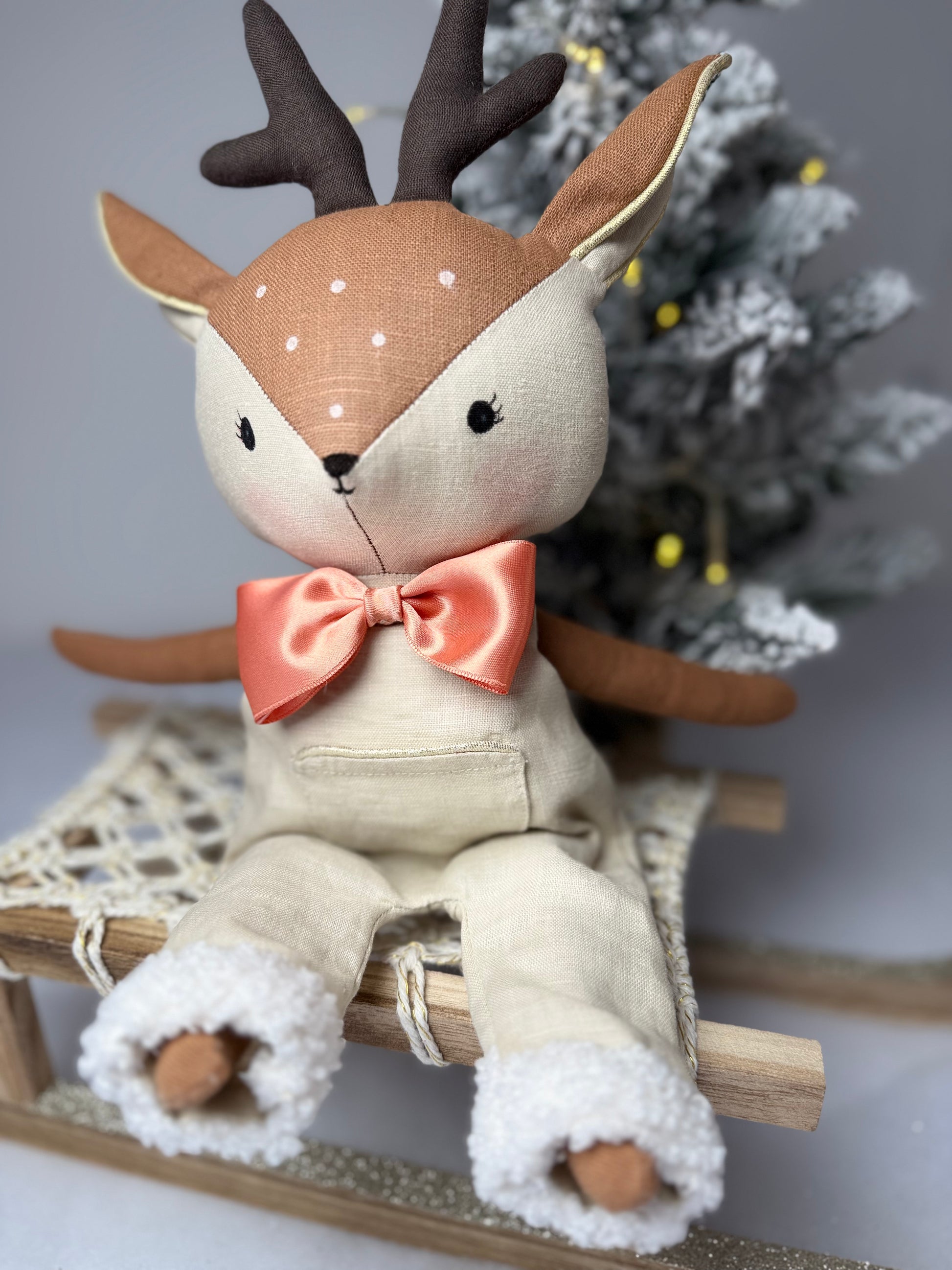 Voici Ruben, une tendre renne au style scandinave, réalisé entièrement à la main dans mon atelier. Avec sa salopette en lin et son noeud papillon satin couleur pêche saumoné, Ruben incarne l'élégance, la douceur et la poésie des fêtes de Noël.