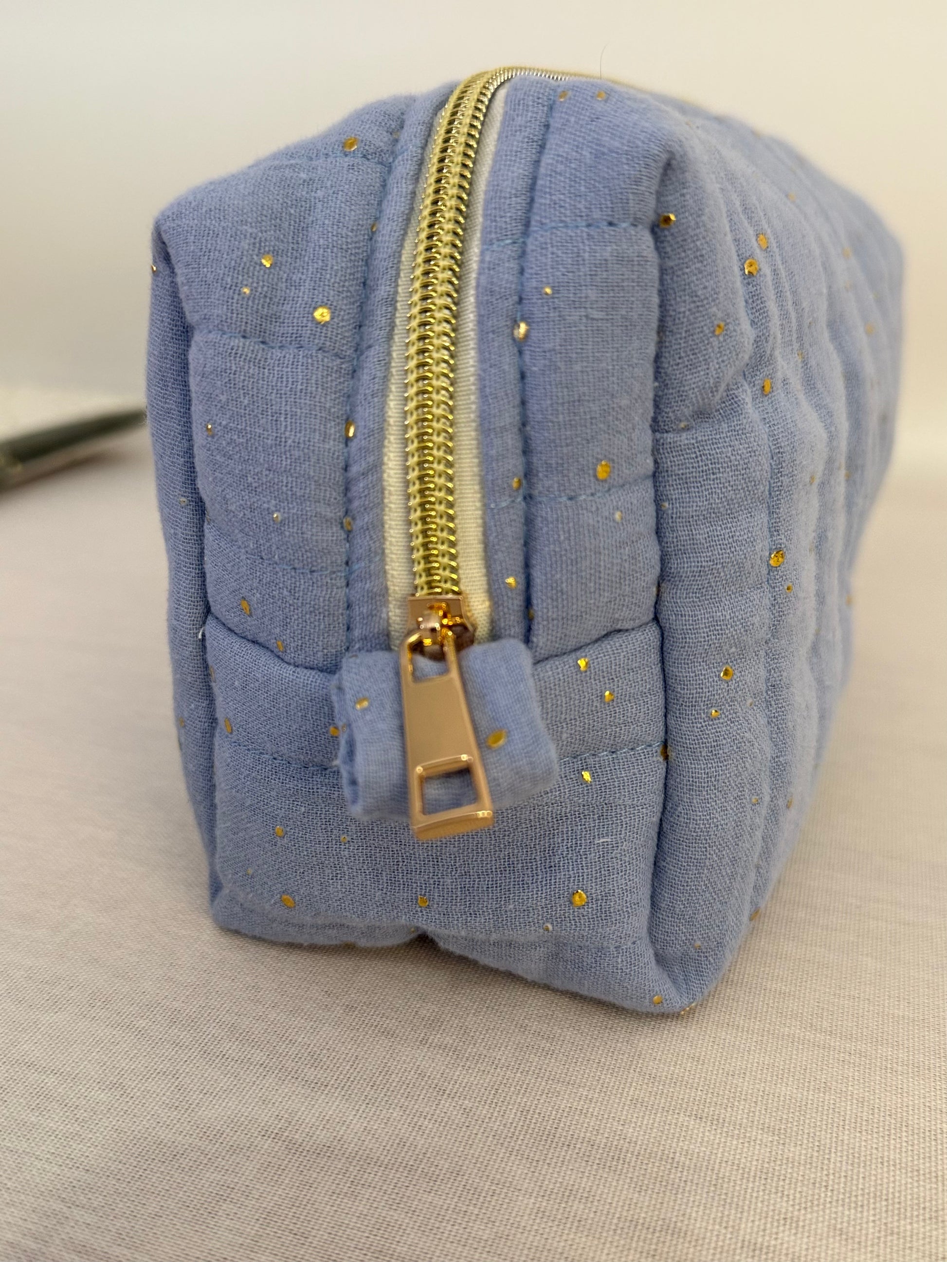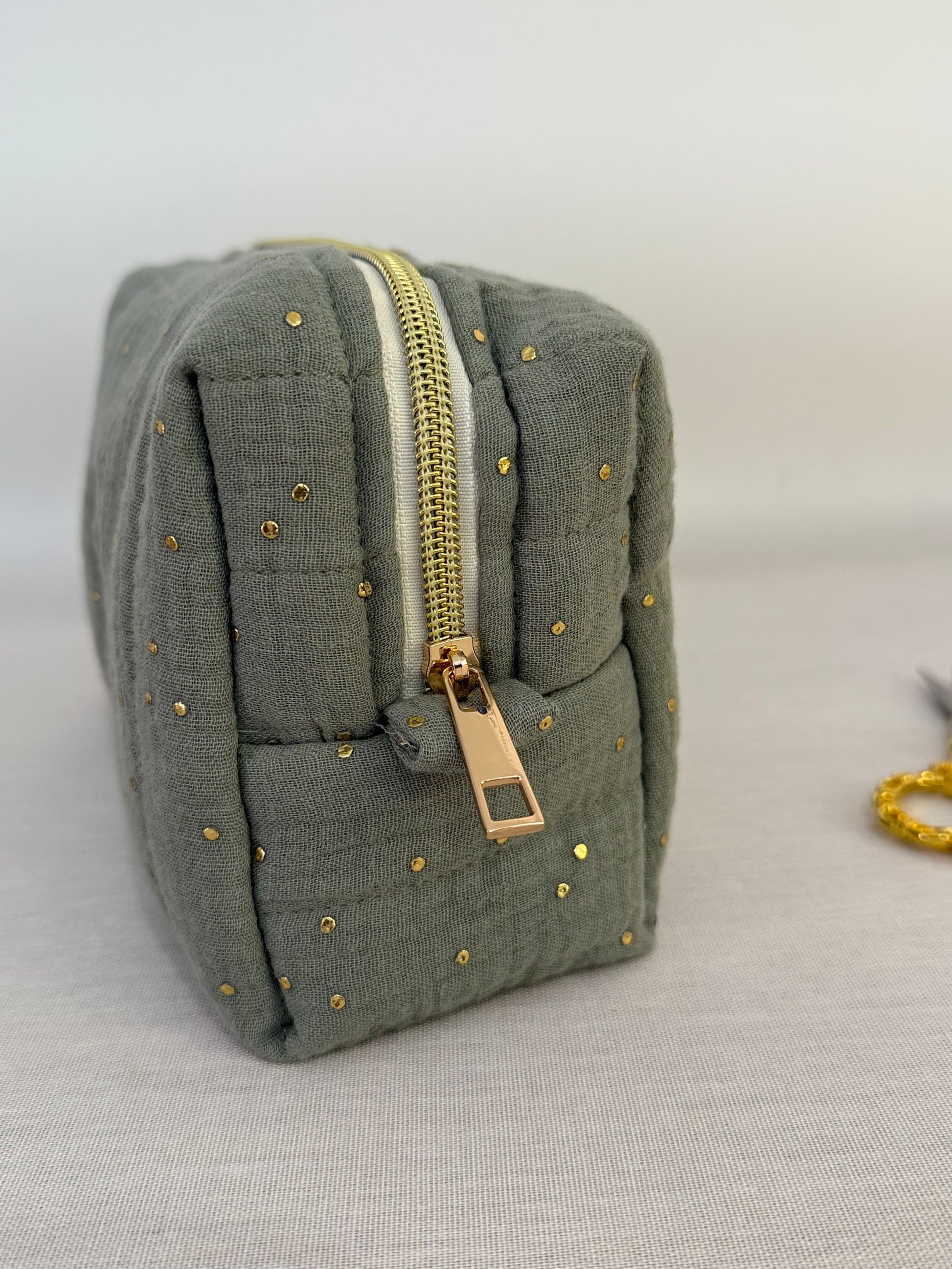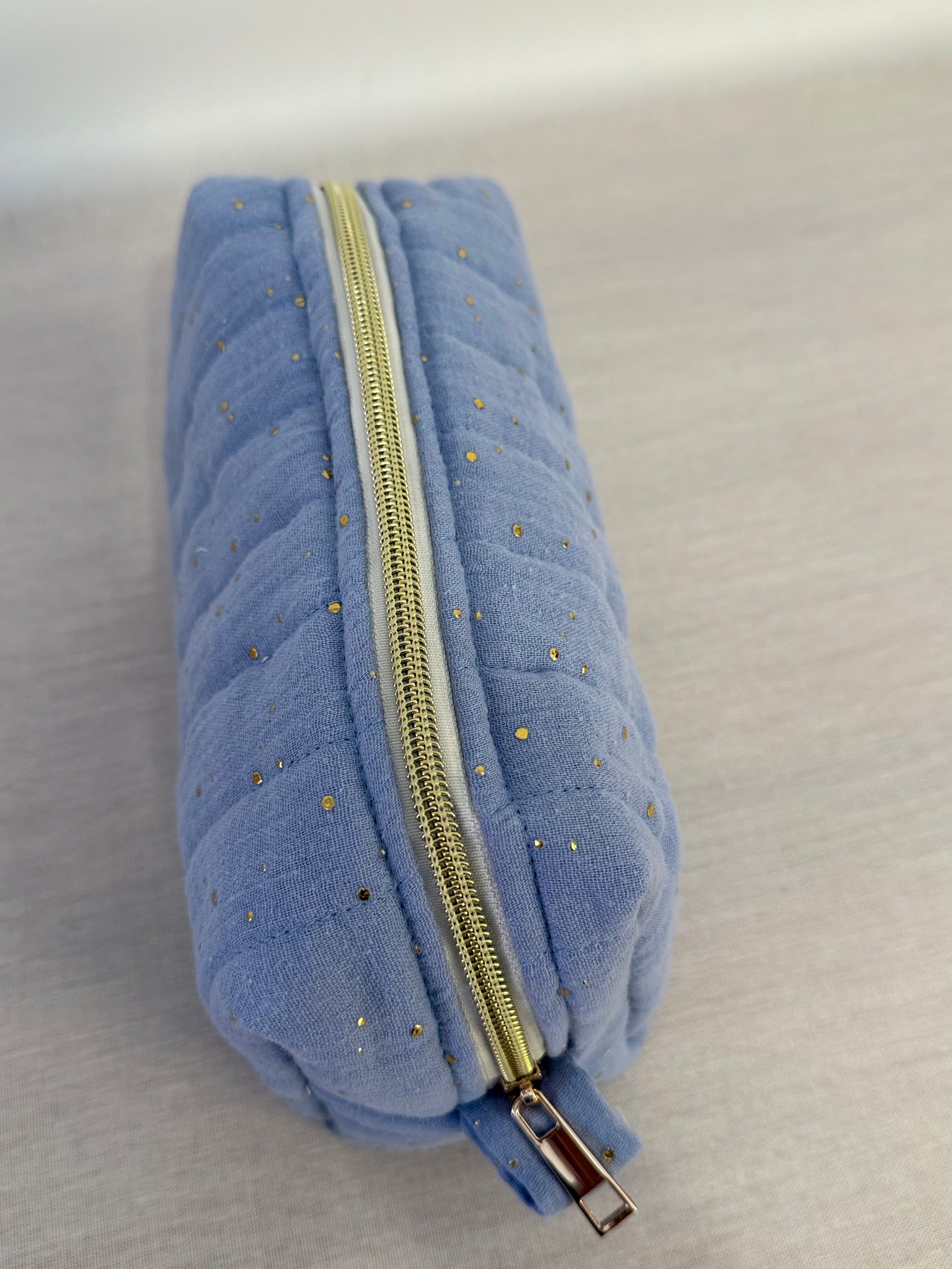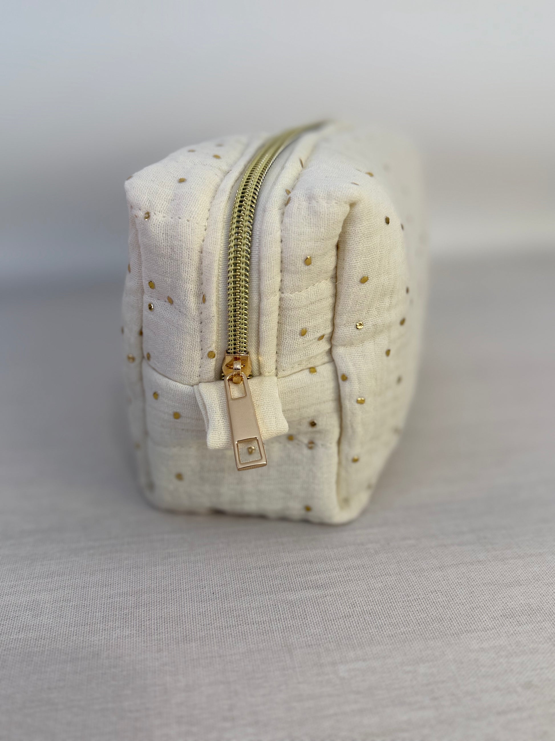 Rangez les essentiels de vos petits ou vos accessoires avec élégance grâce à notre trousse de toilette Coton Essentiel. Confectionnée à la main en double en gaze douce à pois doré, elle allie praticité et charme. Disponible en 6 couleurs délicates: vieux rose, vert sauge, beige, moutarde, bleu ciel, bleu marine. Une touche de style et de douceur pour le quotidien.